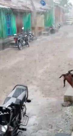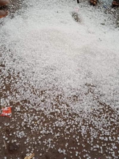 वादळी वाऱ्यासह मुसळधार पाऊस झाला आहे, त्यासोबत गार पडल्याने रस्त्यावर पांढरा बर्फ बडल्यासारखं दिसत होतं