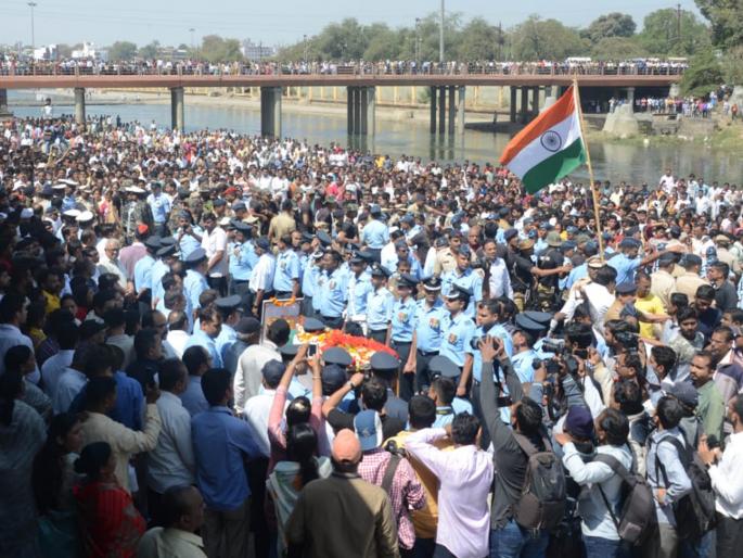 1 / 15जम्मू-काश्मिरच्या भारत-पाक सीमेवर मागील चार दिवसांपासून निर्माण झालेल्या आपत्कालीन परिस्थीतीत लढाऊ हेलिकॉप्टरद्वारे सीमेवर टेहळणी करत असताना हेलिकॉप्टर कोसळून वैमानिक निनाद अनिल मांडवगणे (वय ३३) यांना वीरमरण आले. 2 / 15वायू सेनेच्या वतीने सजवलेल्या वाहनातून त्यांचे पार्थिव डिजीपी नगर येथील शहीद निनाद यांच्या निवासस्थानी नेण्यात आले तेथे त्यांच्या कुटुंबीय आणि नाशिकमधील हजारो नागरिकांनी अंत्य दर्शन घेतलं.3 / 15नाशिक भारतीय वायुसेनेच्या तुकडीने, पोलिसांच्या तुकडीने शहीद निनाद यांचे पार्थिव त्यांच्या निवास्थानी पोहोचवले4 / 15आपल्या गावच्या भूमिपुत्राला पाहण्यासाठी नागरिकांस प्रशासन अन् पत्रकारांनीही यावेळी गर्दी केली होती.5 / 15नाशिक शहीद निनाद यांच्या माता-पित्याचे सांत्वन करताना निवासस्थानी भारतीय वायुसेनेचे अधिकारी6 / 15शहीद निनाद यांचे पार्थिव दर्शनासाठी अमरधाम मैदानात ठेवण्यात आले होते. त्यावेळी आपल्या मुलाच्या पार्थिवाचे अंत्यदर्शन घेताना जन्मदाता आई अन् पिता, काळजावर दगड ठेवावा असा हा कठीण प्रसंग7 / 15निशब्द होऊन जावं, काय कॅप्शन द्यावं. देशासाठी शहीद झालेल्या आपल्या बापाला काय बर सांगत असेल हे चिमुकलं बाळ8 / 15शहीद निनाद मांडवगणे यांच्या अंत्यसंस्कारासाठी नाशिकच्या अमरधाममध्ये हजारोंचा समुदाय, तिरंगा ध्वज हातात घेऊन वंदे मातरम आणि भारत माता की जयचा जयघोष करत होता.9 / 15शहीद निनाद यांच्या अंत्यसंस्कारासाठी नाशिक अमरधाम येथे मोठी गर्दी झाली असून मानवंदना देण्यासाठी वायू सेनेचे पथकही दाखल झाले होते.10 / 15वायू सेनेतील अधिकाऱ्यांनी देशाची शान असलेला तिरंगा शहीद निनाद यांच्या वीरपत्नीकडे सुपूर्द केला, या वीरपत्नीच्या धैर्याला सॅल्यूट11 / 15कुठून येतं हे धैर्य, कुठून येतो हा जज्बा, पतीच्या निधनानंतरही समोरच्या परिस्थितीला सामोरे जाताना सॅल्यूट करण्यासाठी उचललेला हा हात म्हणजे.... जय हिंद12 / 15शहीद जवान अमर रहे, भारत जिंदाबाद पाकिस्तान मुर्दाबादच्या घोषणांनी दुमदुमला परिसर. तसेच तोफखान्याच्या जवानांनी शहीद निनाद मंडवगणे यांना सशस्त्र मानवंदना दिली13 / 15पालकमंत्री गिरीश महाजन, महापौर रंजना भानसी, आमदार देवयानी फरांदे, उपमहापौर प्रथमेश गीते हेही अंत्यदर्शनासाठी उपस्थित होते14 / 15शाहिद निनाद यांना निरोप देण्यासाठी गोदाकाठी जनसागर उसळला आहे. भारत माता की जय अशा घोषणांनी परिसर दुमदुमून गेला. तिरंगा ध्वज घेऊन नागरिक आले असून शाळकरी मुलांचाही समावेश आहे.15 / 15अमर रहे अमर रहे... वीर जवान निनाद मांडवगणे अमर रहे..... भारमातेच्या वीरपुत्रास 'भावपूर्ण श्रद्धांजली'