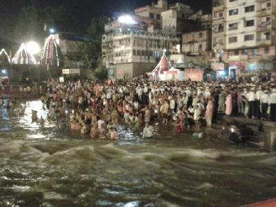 सूर्य चंद्र आणि गुरू हे ग्रह सिंह राशीत असतानाच श्रावणी अमावास्या असा दुर्मिळ योग जुळून येथील त्र्यंबकेश्वरमध्ये कुशावर्त तीर्थावर साधू-संतांनी दुस-या शाहीस्नान सुरुवात केली.