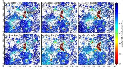या चित्रात दाखवलेला नकाशा दोन उपग्रहांचा डेटा दाखवत आहे. जर दोन्ही उपग्रहांचा डेटा सारखा दिसत असेल, म्हणजे एक समस्या आहे. हा नकाशा दिल्ली आंतरराष्ट्रीय विमानतळाजवळील कापशेरा भागाचा आहे. ज्यामध्ये तीन टप्प्यांत अभ्यास करण्यात आला आहे. २०१४ ते २०१६, २०१६ ते २०१८ आणि २०१८ ते २०१९. येथे पहिल्या टप्प्यात २२ सेमी, दुसऱ्या टप्प्यात ३२ सेमी आणि तिसऱ्या टप्प्यात २० सेमी जमीन खचली आहे. पाच वर्षांत एकूण ७५ सें.मी. म्हणजेच कापशेरा परिसरातील भूजल पातळीबाबत कठोर पावले उचलली गेली नाहीत, तर हा परिसर धोकादायक ठरू शकतो. तिन्ही टप्प्यात दोन्ही उपग्रहांचा डेटा सारखाच दिसत आहे.