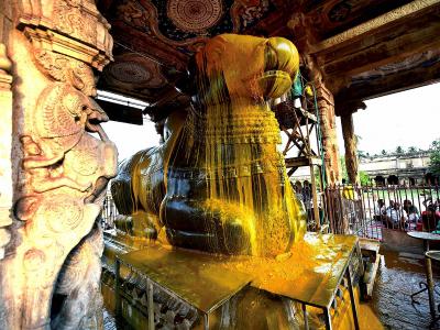 बृहदेश्वर मंदिरातील महाकाय नंदीला भक्तांनी अभिषेक घालून पुजेला सुरुवात केली.