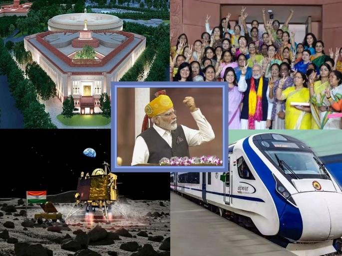 1 / 14भारतीय संस्कृतीत आकाश, वायू, अग्नी, जल आणि पृथ्वी या पाच तत्त्वांना असाधारण महत्त्व आहे. ही पंचतत्त्वे जीवनातील महत्त्वाचे घटक असतात. २०२३ या सरत्या वर्षांत भारताने विविध क्षेत्रांत केलेल्या अतुल्य कामगिरीने या पंचतत्त्वांवर आपली मुद्रा कोरली आहे. चंद्रयान आणि सूर्ययानाच्या माध्यमातून भारताने अवकाशाला गवसणी घातली, तर वायूप्रमाणे सर्वांत वेगवान गतीने वाढणारी आपली अर्थव्यवस्था जगात पाचव्या स्थानावर पोहोचली. अग्नितेजाप्रमाणे संरक्षणक्षेत्रात तेजस्वी भरारी घेत भारत निर्यातदार देश ठरला. वाराणसीहून ढाका मार्गे दिब्रूगडला जाणारी गंगाविलास ही नदीतून सर्वात लांब प्रवास करणारी क्रूझ याच वर्षात लाँच झाली. जलतत्त्वाशी जोडली गेलेली ही क्रूझ पाच राज्य आणि दोन देशांमधून तब्बल ५१ दिवसांचा प्रवास करते. पृथ्वी अर्थात मातीशी जोडल्या गेलेल्या दोन घटनांमध्येही भारताने ठसा उमटवला. उत्तरकाशीतील बोगदा दुर्घटनेत ४१ कामगार अडकले होते. या कामगारांना अथक प्रयत्नांतून १७ दिवसांनी सुखरूप बाहेर काढण्यात यश आले, ही जगातील दुर्मीळ घटना ठरली. तर जम्मू काश्मीर पाठोपाठ राजस्थानात सापडलेल्या लिथियम साठ्यांमुळे मोठा खजिना भारताच्या हाती गवसला. या सर्व सकारात्मक घडामोडींमुळे मावळते वर्ष देशासाठी आणि आपल्यासाठी चांगल्या आठवणीही देऊन जात आहे.2 / 14पंतप्रधान नरेंद्र माेदी यांच्या हस्ते संसदेच्या भव्य अशा नव्या इमारतीचे २८ मे राेजी लाेकार्पण करण्यात आले. नव्या संसद भवनात लाेकसभेचे १ हजार आणि राज्यसभेचे ४०० खासदार बसू शकतील. नवी इमारत बांधण्यासाठी सुमारे ८६२ काेटी रुपये खर्च झाले.3 / 14देशभरात २०२३ वर्षाअखेरपर्यंत एकूण ४१ वंदे भारत व २ अमृत भारत एक्स्प्रेस सुरू करण्यात आल्या. त्यापैकी महाराष्ट्राच्या वाट्याला ७ वंदे भारत एक्स्प्रेस आल्या.4 / 14भारताच्या अध्यक्षतेखाली आयोजित जी-२० शिखर परिषदेला ऐतिहासिक यश मिळाले. परिषदेने भारताचा सन्मान वाढविला. परिषदेचा जाहिरनामा प्रथमच एकमताने मंजूर झाला. याच परिषदेत दक्षिण आफ्रिकेचा समावेश हाेऊन जी-२०चा जी-२१ असा विस्तारही झाला.5 / 14महिलांना लाेकसभा आणि राज्यसभेत ३३ टक्के आरक्षण देणारे ‘नारी शक्ती वंदन विधेयक’ संसदेत २१ सप्टेंबर राेजी मंजूर झाले. त्यानंतर २९ सप्टेंबर राेजी राष्ट्रपती द्रौपदी मुर्मू यांनी त्यावर स्वाक्षरी केली आणि विधेयकाचे कायद्यात रूपांतर झाले. येत्या काळात हा कायदा लागू होणार आहे.6 / 14भारताच्या दृष्टीने चंद्रयान-३ हे चंद्राच्या पृष्ठभागावर यशस्वीरीत्या उतरणे, हे सर्वात माेठे यश ठरले. २३ ऑगस्ट राेजी चंद्रयान-३ चंद्रावर उतरले आणि भारत चंद्राच्या दक्षिण ध्रुवावर पोहोचणारा पहिला देश ठरला. त्यानंतर ‘आद