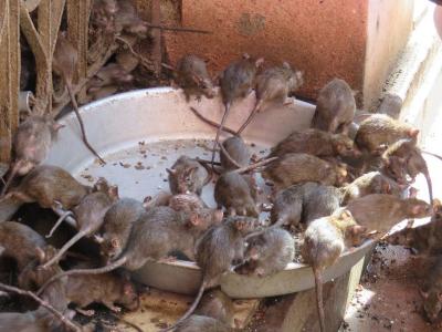 ५) करणीमाता मंदिर, राजस्थान - राजस्थानमधील या मंदिरात करणी देवी उंदिराच्या रूपात आहे, असा भक्तांचा समज आहे. म्हणून उंदिरांनी चाखलेले दूध भक्तांना प्रसाद म्हणून दिला जातो.