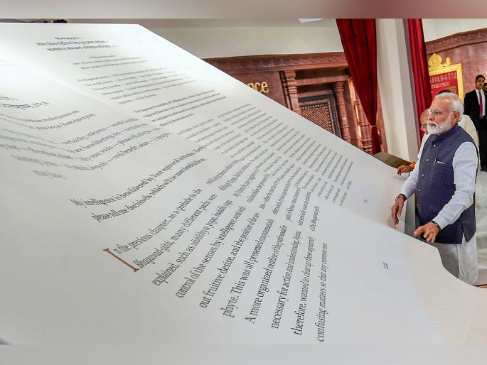 1 / 7दिल्लीतील इस्कॉन मंदिरात पंतप्रधान नरेंद्र मोदी यांच्या हस्ते मंगळवारी विशाल भगवद्गीतेचे अनावरण झाले. 2 / 7दिल्लीतील इस्कॉन मंदिरात पंतप्रधान नरेंद्र मोदी यांच्या हस्ते मंगळवारी विशाल भगवद्गीतेचे अनावरण झाले. 3 / 7 या भगवद्गीतेचे 'एस्टांउडिंग भगवद्गीता' असे नामकरण करण्यात आले आहे.4 / 7इस्कॉनकडून मिळालेल्या माहितीनुसार, भगवद्गीता 670 पानांची असून, तिचे वजन 800 किलो आहे. तसेच, या भगवद्गीतेचा आकार 2.8 मीटर X 2 मीटर आहे. 5 / 7या भगवद्गीतेला जगातील सर्वात मोठे धार्मिक व पवित्र पुस्तक म्हणून सादर केले जाणार आहे. 6 / 7भगवद्गीतेचे उद्घाटन केल्यानंतर नरेंद्र मोदी यांनी एका कार्यक्रमाद्वरे जनतेला संबोधित केले.7 / 7इस्कॉन मंदिरात पोहचण्यापूर्वी नरेंद्र मोदी यांनी मेट्रोमधून प्रवास करताना दिसून आले.
