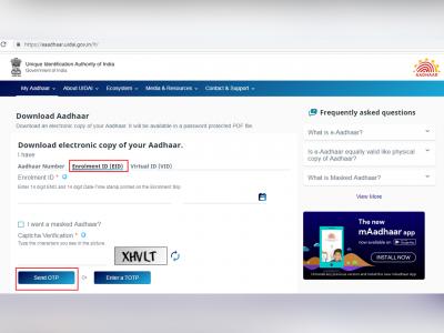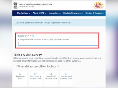 ई-आधार कार्ड डाऊनलोड करण्यासाठी मोबाईल नंबर, त्यानंबरवर पाठवण्यात आलेला वन टाईम पासवर्ड म्हणजेच ओटीपी, नाव, पत्ता आणि आपली जन्मतारीख याचे तपशील द्या. त्यानंतर आधार कार्ड आपल्या पत्त्यावर पाठवले जाते.