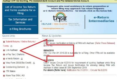 आयकर विभागाच्या वेबसाईटवर डाव्या बाजुला क्विक लिंक्समध्ये चार नंबरला Link Aadhaar नावाची लिंक आहे. त्यावर क्लिक करावे लागेल.