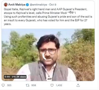 भारतीय जनता पक्षाने (भाजप) आम आदमी पार्टीच्या गुजरात युनिटचे अध्यक्ष गोपाल इटालिया यांनी पंतप्रधान नरेंद्र मोदी यांच्या विरोधात आक्षेपार्ह टिप्पणी केल्याचा आरोप केला आहे. भाजप आयटी सेलचे प्रमुख अमित मालवीय यांनी ट्विटरवर एक व्हिडिओ शेअर केला आहे ज्यामध्ये गोपाल इटालिया पंतप्रधान मोदींना 'नीच आदमी' म्हणताना ऐकू येत आहेत. हा व्हिडिओ 2019 चा असून लोकसभा निवडणुकीच्या प्रचारादरम्यानचा आहे. परंतू त्याचा वापर आता केला जात आहे.