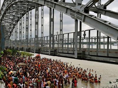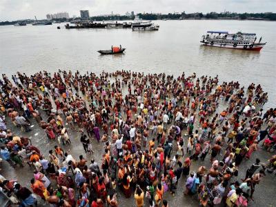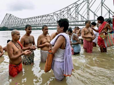 पूर्वजांच्या आत्म्याला शांती मिळावी, यासाठी कोलकात्यातील गंगा नदीच्या काठावर पिंड दान करताना काही भाविक
