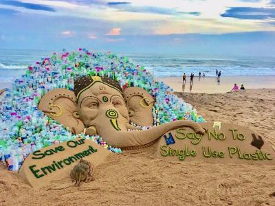 पुरी येथे वाळूमध्ये 1 हजार प्लास्टिकचा बॉटलचा वापर करून केला गणपती