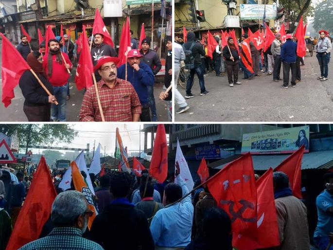 1 / 14केंद्र सरकारच्या कामगारविरोधी धोरणांच्या निषेधार्थ विविध कामगार संघटनांनी बुधवारी भारत बंदची हाक दिली आहे. या बंदमध्ये देशभरातील 25 कोटी कामगार सहभागी होत असल्याचा दावा केंद्रीय कामगार संघटनांनी केला आहे. मात्र बंदमधून रेल्वे व अत्यावश्यक सेवांना वगळण्यात आले आहे. आजच्या या भारत बंददरम्यान देशातील काही कामगार संघटनांनी आंदोलन केले. यावेळी आंदोलकांनी पश्चिम बंगालमधील कंचरापारा येथे ट्रेन अडवल्या. तसेच, या बंदध्ये केंद्र व राज्य सरकार, सार्वजनिक बँका, विमा, पोर्ट ट्रस्ट, संरक्षण, बीपीसीएल, एचपीसीएल, बीएसएनएल, एमटीएनएल, पालिका, महापालिका कर्मचारी तसेच टॅक्सी, रिक्षा, मालवाहतूकदार, अंगणवाडी, आशा वर्कर्स, घरकामगार, माथाडी, बांधकाम कामगार सहभागी झाल्याचे सांगण्यात येत आहे. 2 / 14केंद्र सरकारच्या कामगारविरोधी धोरणांच्या निषेधार्थ विविध कामगार संघटनांनी बुधवारी भारत बंदची हाक दिली आहे. या बंदमध्ये देशभरातील 25 कोटी कामगार सहभागी होत असल्याचा दावा केंद्रीय कामगार संघटनांनी केला आहे. मात्र बंदमधून रेल्वे व अत्यावश्यक सेवांना वगळण्यात आले आहे. आजच्या या भारत बंददरम्यान देशातील काही कामगार संघटनांनी आंदोलन केले. यावेळी आंदोलकांनी पश्चिम बंगालमधील कंचरापारा येथे ट्रेन अडवल्या. तसेच, या बंदध्ये केंद्र व राज्य सरकार, सार्वजनिक बँका, विमा, पोर्ट ट्रस्ट, संरक्षण, बीपीसीएल, एचपीसीएल, बीएसएनएल, एमटीएनएल, पालिका, महापालिका कर्मचारी तसेच टॅक्सी, रिक्षा, मालवाहतूकदार, अंगणवाडी, आशा वर्कर्स, घरकामगार, माथाडी, बांधकाम कामगार सहभागी झाल्याचे सांगण्यात येत आहे. 3 / 14केंद्र सरकारच्या कामगारविरोधी धोरणांच्या निषेधार्थ विविध कामगार संघटनांनी बुधवारी भारत बंदची हाक दिली आहे. या बंदमध्ये देशभरातील 25 कोटी कामगार सहभागी होत असल्याचा दावा केंद्रीय कामगार संघटनांनी केला आहे. मात्र बंदमधून रेल्वे व अत्यावश्यक सेवांना वगळण्यात आले आहे. आजच्या या भारत बंददरम्यान देशातील काही कामगार संघटनांनी आंदोलन केले. यावेळी आंदोलकांनी पश्चिम बंगालमधील कंचरापारा येथे ट्रेन अडवल्या. तसेच, या बंदध्ये केंद्र व राज्य सरकार, सार्वजनिक बँका, विमा, पोर्ट ट्रस्ट, संरक्षण, बीपीसीएल, एचपीसीएल, बीएसएनएल, एमटीएनएल, पालिका, महापालिका कर्मचारी तसेच टॅक्सी, रिक्षा, मालवाहतूकदार, अंगणवाडी, आशा वर्कर्स, घरकामगार, माथाडी, बांधकाम कामगार सहभागी झाल्याचे सांगण्यात येत आहे. 4 / 14केंद्र सरकारच्या कामगारविरोधी धोरणांच्या निषेधार्थ विविध कामगार संघटनांनी बुधवारी भारत बंदची हाक दिली आहे. या बंदमध्ये देशभरातील 25 कोटी कामगार सहभागी होत असल्याचा दावा केंद्रीय कामगार संघटनांनी केला आहे. मात्र बंदमधून रेल्