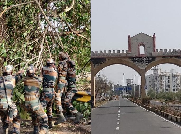 1 / 10संकट देशावरील असो किंवा देशात असो, भारतीय सैन्य सदैव संकटाचा सामना करण्यासाठी तत्पर असतो. ऊन, पाऊस, वारा याची तमा न बाळगता भारतीय सैन्य देशाच्या, नागरिकांच्या मदतीला धावतं. 2 / 10भूदल, वायूदल आण नौ दल या तिन्ही दलांसह सैन्य दलातील इतरीह तुकड्या सदैव तत्पर असतात. सध्या तौक्ते चक्रीवादळाच्या तडाख्यानंतरही नागरिकांच्या मदतीसाठी सैन्य दलाने धाव घेतली आहे. 3 / 10एनडीआरएफचे जवान पाण्यात उतरुन, पडलेली झाडे तोडून लोकांच्या जीवन सुरळीत करण्यासाठी धडपडताना दिसत आहे. महाराष्ट्रासह 8 राज्यांत बसलेल्या तडाख्याला सावरण्याचा प्रयत्न होत आहे. 4 / 10दिव-दमण मध्येही या वादळाचा चांगलाच तडाखा बसलाय, दिवमधील मेन रोड या वादळाच्या तडाख्यात पडलेल्या झाडांमुळे बंद झाला होता. त्यामुळे, भारतीय सैन्याच्या जवांनी घटनास्थळी धाव घेतली. 5 / 10सैन्य दलाच्या 36 तासांच्या अथक परिश्रमानंतर दीव येथील प्रमुख रस्ता सर्वांसाठी खुला झाला आहे. हा मेन रोड बंद झाल्याने नागरिकांचा संपर्कच तुटला होता. त्यात वीजपुरवठाही खंडीत झाला होता. 6 / 10कोरोनामुळे रुग्णवाहिक आणि वैद्यकीय सेवांसाठी वाहनांची ये-जा सुरू आहे. मात्र, चक्रीवादळाच्या तडाख्यामुळे तब्बल 36 तासांपर्यंत हा रस्ता प्रवासासाठी वापरात येत नव्हता, अखेर सैन्य दलाने मोहिम फत्ते केली. 7 / 10तौक्ते’ चक्रीवादळाच्या तडाख्यामुळे गुजरातच्या १२ जिल्ह्यांमध्ये आतापर्यंत ४५ जणांचा मृत्यू झाला असून, प्रचंड नुकसान झाले आहे. पंतप्रधान नरेंद्र मोदी यांनी बुधवारी चक्रीवादळाने प्रभावित भागाची हवाई पाहणी केली. मुख्यमंत्री विजय रुपाणी हेदेखील त्यांच्यासोबत होते.8 / 10मुंबईत तौक्ते चक्रीवादळामुळे उधाणलेल्या समुद्राच्या तडाख्यात सापडून भरकटलेल्या ५ नौकांपैकी पी-३०५ या बार्जवरील २६ जणांचे मृतदेह बुधवारी तटरक्षक दल पथकाच्या हाती लागले. उर्वरित ४९ जणांचा शोध अद्याप सुरूच आहे. 9 / 10चक्रीवादळाच्या तडाख्यात सापडल्याने पी-३०५ या बार्जवरील (कर्मचाऱ्यांच्या निवासाची सोय असणारी मोठी तराफा) २७३ जणांचा जीव धोक्यात आला होता. याशिवाय, गॅल कन्स्ट्रक्टरवर १३७, ‘सागरभूषण’वर १०१, तर एस. एस. -३ वर १९६ जण अडकून पडले होते. 10 / 10भारतीय नौदलाच्या आयएनएस कोची, आयएनएस कोलकत्ता, आयएनएस तलवार या युद्धनौकांसह बेतवा, तेग, बिआस ही जहाजे पी-८१ विमानासह सी-किंग हेलिकाॅप्टर्स या बचावकार्यात गुंतली आहेत. याशिवाय, तटरक्षक दलाच्या सम्राट, अन्य जहाजे आणि चेतक हेलिकाॅप्टर्ससह खासगी संस्थांकडून मदतकार्यासाठी लागणारी टोईंग आणि अन्य जहाजे या कामात वापरण्यात येत आहेत.