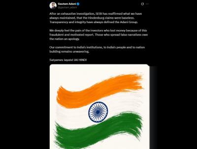 खोट्या बातम्या पसरवणाऱ्यांनी देशाची माफी मागावी. भारताच्या संस्थांप्रती, भारताच्या जनतेप्रती आणि राष्ट्र उभारणीप्रती आमची वचनबद्धता अढळ आहे. सत्यमेव जयते! जय हिंद!, असे गौतम अदानी यांनी आपल्या एक्स पोस्टमध्ये म्हटले आहे. यासोबत त्यांनी भारताचा तिरंगा झेंडा फोटो म्हणून जोडला आहे.