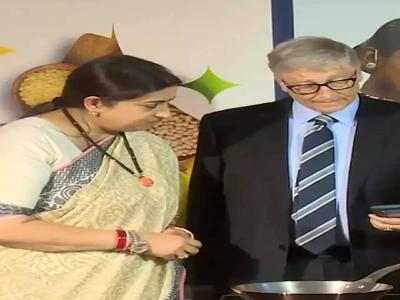 केंद्रीय मंत्री इराणी यांच्यासोबत खिचडी बनवण्याची प्रक्रिया पाहताना बिल गेट्स.