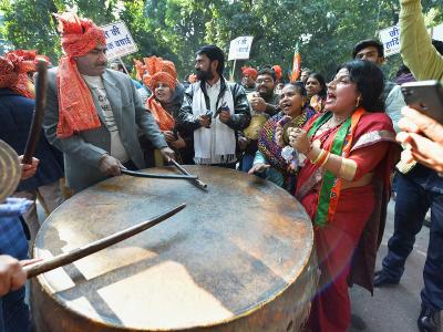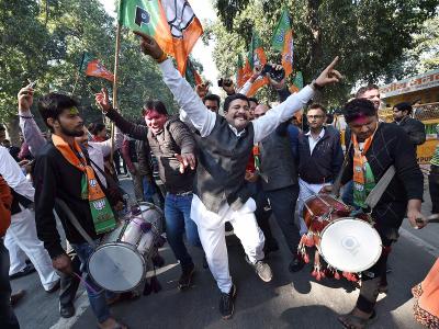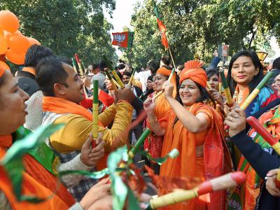 नवी दिल्लीमध्ये भाजपाच्या कार्यकर्त्यांनी गरबा खेळून आनंद साजरा केला.