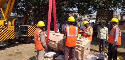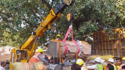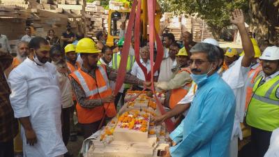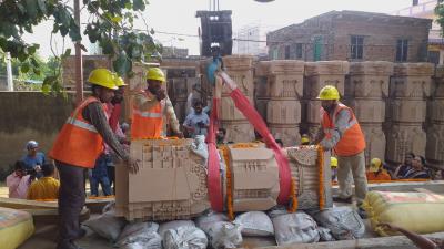 मंदिराच्या पायासाठी लागणाऱ्या कोरीव नक्षीदार खांबांचे मंदिर परिसरात आगमन होत आहे. कारखान्याच्या वर्कशॉपमधून हे खांब मंदिर परिसरात क्रेनच्या सहाय्याने आणले जात आहेत.