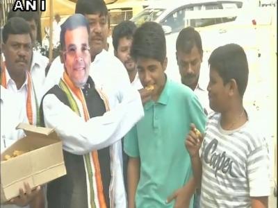 राहुल गांधी पक्षाचे अध्यक्ष झाल्याच्या आनंदात एक कार्यकर्ता चेह-याला राहुल गांधींचे मास्क लावून मिठाई भरवताना.