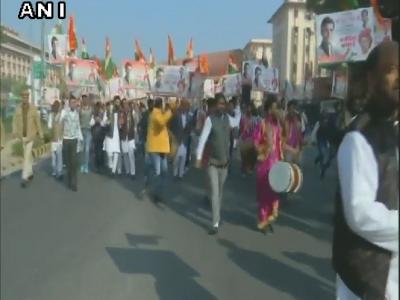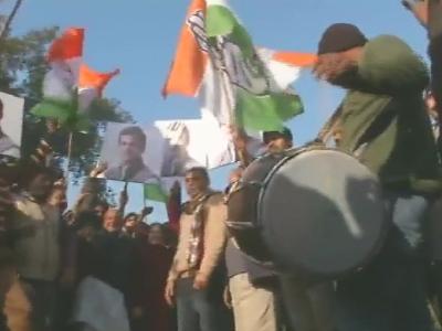 हातात काँग्रेसचे झेंडे आणि ढोल ताशाच्या गजरात दिल्लीतील काँग्रेस मुख्यालयाकडे निघालेले कार्यकर्ते