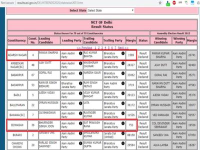 बिजवासन येथे भाजपाचे सतप्रकाश राणा यांना आपच्या भूपिंदर सिंह यांनी पराभूत केले आहे. याठिकाणी फक्त ७५३ मतांनी भाजपा उमेदवाराचा पराभव झाला आहे. तर आदर्शनगर येथे आपच्या पवन शर्मा यांनी भाजपाच्या राज कुमार भाटियांचा पराभव केला. तिथे १ हजार ५८९ मतांनी भाजपाचा पराभव झाला आहे.