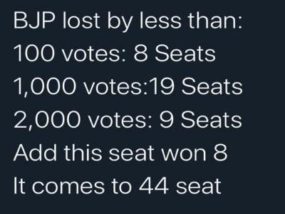 या मॅसेजबाबत सत्यता पडताळली असता हा दावा खोटा असल्याचं समोर येतं. फक्त २ जागा अशा आहेत ज्याठिकाणी भाजपा २ हजारांच्या पेक्षा कमी मताने पराभूत झाली आहे. उर्वरीत जागांवरील फरक मोठा आहे.