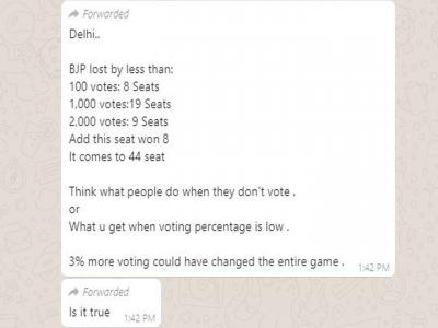 या मॅसेजमध्ये असा दावाही केला आहे दिल्लीत फक्त ३ आणखी मतदान वाढलं असतं तर स्थिती वेगळी असती. जर असं झालं असतं तर भाजपाची सत्ता आली असती आणि त्यांनी ४४ जागा जिंकल्या असत्या.