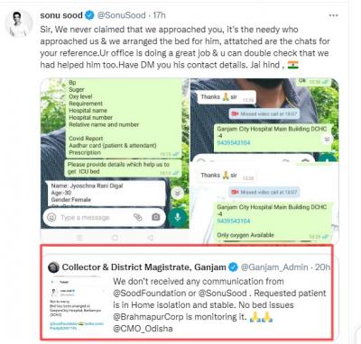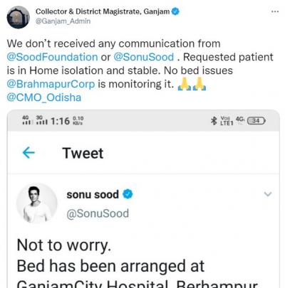 सोनू सूदच्या ट्विटला रिट्विट करत ओडिशातील गंजाम जिल्ह्याचे कलेक्टर यांनी सोनू सूदच्या मदतीचा दावा फेटाळला होता. तसेच, सोनू सूदच्या फाऊंडेशनकडून कुठलिही मदत मिळाली नसल्याचे ट्विटरवरुन सांगण्यात आले होते.