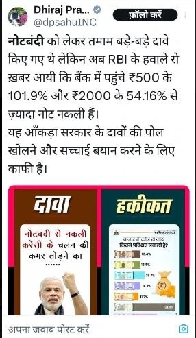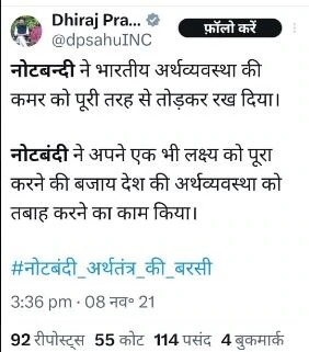 8 नोव्हेंबर 2021 रोजी धीरज साहू यांनी त्यांच्या ट्विटमध्ये नोटाबंदीने भारतीय अर्थव्यवस्थेचे कंबरडे मोडले. नोटाबंदीने आपले कोणतेही उद्दिष्ट साध्य होण्याऐवजी देशाची अर्थव्यवस्था उद्ध्वस्त केली असं म्हटलं होतं.