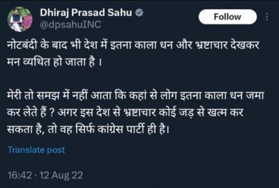 धीरज साहू यांचे हे ट्विट शेअर करत भाजपाने काँग्रेसवर जोरदार निशाणा साधला आहे. साहू यांनी ट्विट करून म्हटले होतं की, "नोटाबंदीनंतरही देशात एवढा काळा पैसा आणि भ्रष्टाचार पाहून मन व्यथित होतं. समजत नाही लोक इतका काळा पैसा कुठून जमा करतात? "