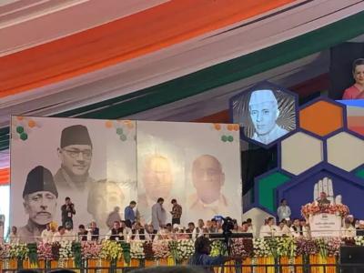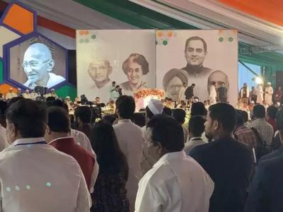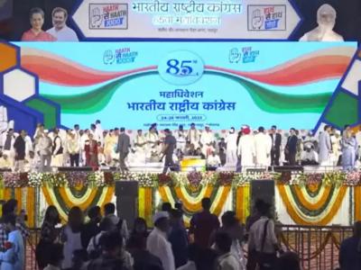 85 व्या अधिवेशनासाठी काँग्रेस पक्षाने तयार केलेले व्यासपीठ. त्यात एका टोकाला नेहरू दिसतात आणि दुसऱ्या बाजूला खर्गे आणि राहुल-सोनियाही दिसतात.