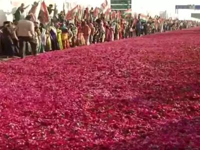 काँग्रेस समर्थकांनी आज सकाळी प्रियंका गांधींच्या स्वागतासाठी रस्त्यावर गुलाबाची फुले उधळली होती. त्यांच्यावर गुलाबांचा वर्षाव करण्यात आला. प्रियांका यांनी हात जोडून सर्वांचे अभिवादन स्वीकारले.