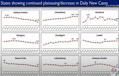 महाराष्ट्र, उत्तर प्रदेश, आंध्र प्रदेश आणि दिल्लीसह देशातील एकूण 18 राज्यांमधील कोरोनाच्या नवीन रुग्णांची संख्या कमी होत आहे, अशी माहिती केंद्रीय आरोग्य मंत्रालयाकडून देण्यात आली. तसंच देशाचा पॉझिटिव्हिटी दर सरासरी 21 टक्के इतका आहे.