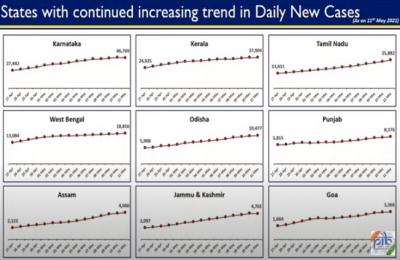 कर्नाटक, केरळ, तामिळनाडू, पश्चिम बंगाल, ओडिशा, पंजाब, आसाम, जम्मू-काश्मीर, गोवा, हिमाचल प्रदेश, पुदुच्चेरी, मणिपूर, मेघालय, त्रिपुरा, नागालँड, आणि अरुणाचल प्रदेशात कोरोना रुग्णांची संख्या दररोज वाढत आहे.