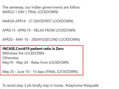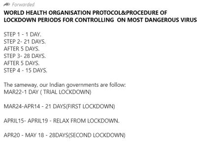 त्याचाच आधार घेत, भारतामध्ये सध्या २१ दिवसांचा लॉकडाऊन सुरू आहे. तो ठरल्याप्रमाणे १४ एप्रिलला संपेल. त्यानंतर १५ ते १९ एप्रिलदरम्यान निर्बंध शिथील केले जातील. मात्र, कोरोनाग्रस्तांची संख्या वाढल्यास २० एप्रिल ते १८ मे असा २८ दिवसांचा लॉकडाऊन जाहीर केला जाईल, असं या मेसेजमध्ये नमूद केलंय. कोरोनाग्रस्तांची संख्या शून्यावर न आल्यास २५ मे ते १० जून हा तिसरा आणि अखेरचा लॉकडाऊन घेण्याचा पर्याय सरकारकडे असेल, असं वेळापत्रक मेसेजमध्ये आहे.