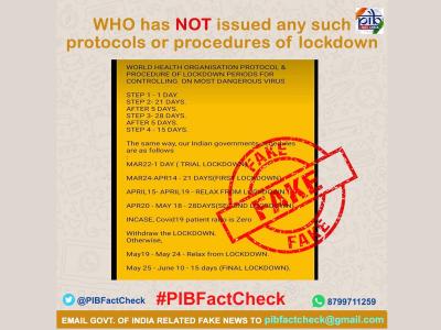 मात्र, WHO च्या नावाने फिरणारा हा मेसेज साफ खोटा असल्याचं पडताळणीतून समोर आलं आहे. जागतिक आरोग्य संघटनेनं कोव्हीड-१९ बद्दल जनजागृतीच्या दृष्टीने अनेक सूचना प्रसिद्ध केल्या आहेत. परंतु, लॉकडाऊबाबत त्यांचा कुठलाही प्रोटोकॉल ठरलेला नाही. ज्या देशाला जशी आवश्यकता भासेल त्यानुसार तो लॉकडाऊनबाबत निर्णय घेऊ शकतो, अशी माहिती प्रेस इन्फॉर्मेशन ब्युरोनं दिली आहे.