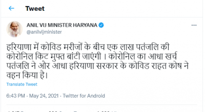 हरियाणाचे आरोग्यमंत्री अनिल वीज यांनी (Anil Vij) यांनी ट्विट करत ही माहिती दिली आहे. हरियाणातील कोरोना रूग्णांमध्ये एक लाख पतंजली कोरोनिल किटचे मोफत वाटप करण्यात येणार आहे असं म्हटलं आहे.