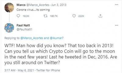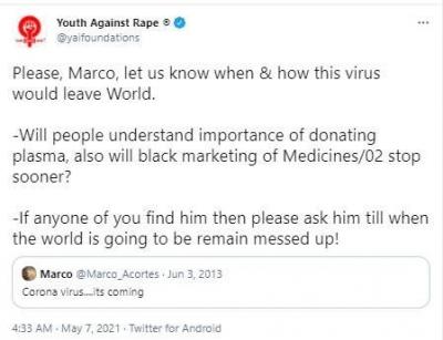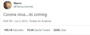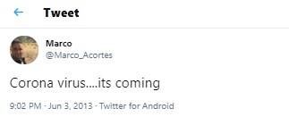 कोरोना व्हायरस येणार आहे, असं ट्विट केलं आहे. हे ३ जून २०१३ रोजी हे ट्विट करण्यात आलं आहे.