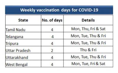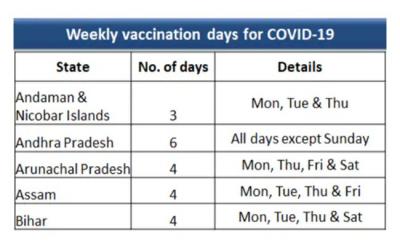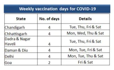 चंदिगड, दिल्ली, छत्तीसगड यासारखी राज्ये/केंद्रशासित प्रदेशांत आठवड्यातून चार दिवस कोरोना लस दिली जाईल. गोवा एक लहान राज्य असल्याने तिथे फक्त शुक्रवारी आणि शनिवारी लसीकरण केले जाईल.
