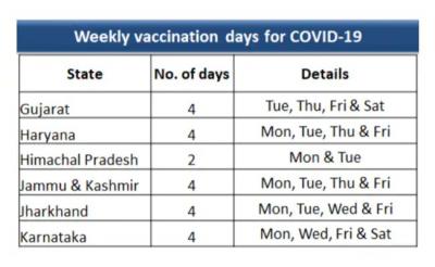गुजरात, कर्नाटक, जम्मू-काश्मीर, झारखंड येथे आठवड्यातून चार दिवस लसीकरण केले जाईल. त्याचबरोबर हिमाचल प्रदेशमध्ये फक्त सोमवार आणि मंगळवारी कोरोना लस दिली जाईल.