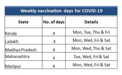 महाराष्ट्र, मध्य प्रदेश, केरळ, मणिपूर येथे आठवड्यातून चार दिवस कोरोना लसीकरण होईल.