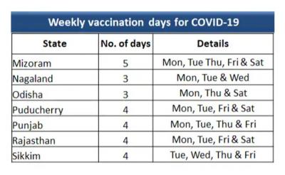 पंजाब, राजस्थान, सिक्कीम येथे चार दिवस कोरोना लस दिली जाईल. तसेच नागालँड आणि ओडिशामध्ये आठवड्यातून तीन दिवस लसीकरण केले जाणार आहे.
