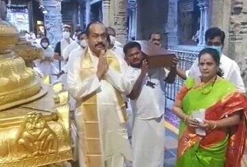 हैदराबादच्या श्रीनिवास दाम्पत्यानं दोन किलो सोनं आणि तीन किलो चांदीनं तयार केलेली सुवर्ण तलवार तिरुपती मंदिरात अर्पण केली आहे. याची एकूण किंमत तब्बल १ कोटींच्या घरात आहे.