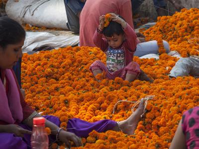 दिल्लीतील बाजार विविध फुलांनी सजला आहे. बाजारात हा लहान मुलगा फुलांमध्ये खेळायचा आनंद घेतो आहे.