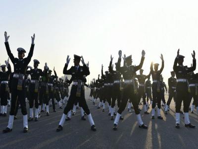 भारतीय फौजांचे (नौदल, पायदल, वायुसेना) वेगवेगळे सेनाविभाग, घोडदळ, पायदळ, तोफखाना आणि इतर अद्ययावत शस्त्रे/ क्षेपणास्त्रे (जसे पृथ्वी, अग्नी), रणगाडे समवेत संचलन करतात. भारतीय राष्ट्रपती या फौजांची मानवंदना स्वीकारतात.