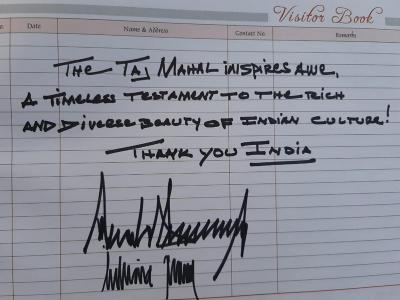 याउलट चित्र 'ताजमहाल'च्या अभिप्राय वहीत पाहायला मिळालं. ट्रम्प यांनी सहकुटुंब ताजमहाल पाहिला. सात आश्चर्यांपैकी एक असलेल्या या आश्चर्याबद्दल गाईडनं त्यांना सविस्तर माहिती दिली.