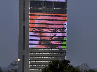 नवी दिल्लीतील एका उंच इमारतीवर तिरंगी रोषणाईसह महात्मा गांधीचे छायाचित्र.