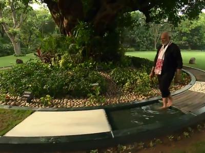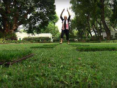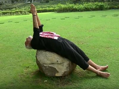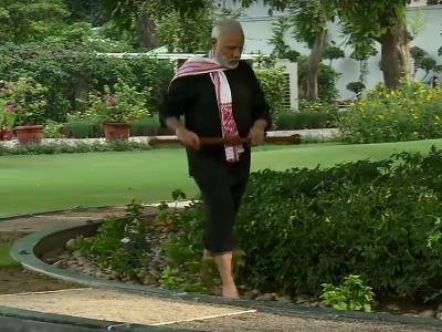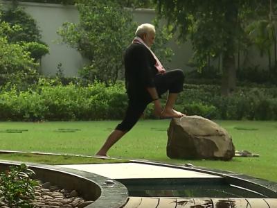 मोदींनी काळ्या रंगाचे कपडे परिधान केलेले असून झाडाभोवती वर्तुळाकार कक्षेत बनवलेल्या ट्रॅकवरुन ते चालताना दिसले. योगाव्यतिरिक्त पंतप्रधान मोदी व्यायाम करतानाही दिसत आहेत.