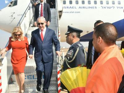 ताज महाल पाहण्यासाठी आलेले इस्त्रायलचे पंतप्रधान बेंजामिन नेतन्याहू लखनऊ विमानतळावर विमानातून उतरताना.