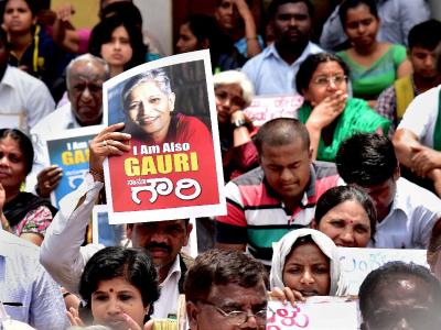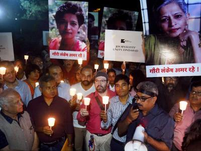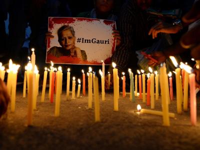 पत्रकार गौरी लंकेश यांच्या हत्येनंतर नवी दिल्लीत इंडिया गेट येथे त्यांना श्रध्दांजली वाहण्यात आली.