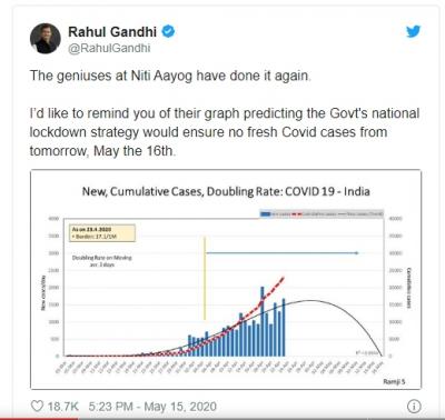 निती आयोगातील बुद्धीजीवी लोकांनी पुन्हा करुन दाखवले, मी तुम्हाला या ग्राफची आठवण करुन दाखवू इच्छितो. केंद्र सरकारच्या देशव्यापी लॉकडाऊनमुळे १६ मे नंतर देशात कोरोनाचा एकही रुग्ण आढळणार नाही, असे ट्विट राहुल गांधींनी केले आहे.
