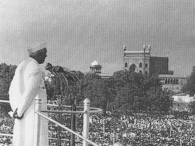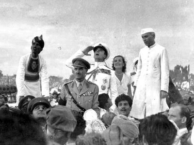 तत्कालीन ब्रिटीश गव्हर्नर लॉर्ड माऊंटबॅटन आणि भारताचे पहिले पंतप्रधान पंडीत जवाहरलाल नेहरु. १५ ऑगस्ट १९४७ रोजी दिल्लीतील इंडिया गेटवर राष्ट्रीय ध्वजाला सलामी देताना.