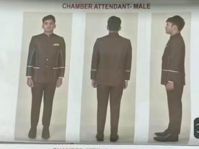 पुरुष चेंबर अटेंडंटच्या गणवेशाचा रंग गडद तपकिरी ठेवण्यात आला आहे. पूर्ण बाही आणि बंद गळ्यातील जॅकेटसह डिझाइन केलेले पँट. जॅकेट आणि पॅंट दोन्ही गडद तपकिरी रंगाचे आहेत. बस जॅकेटमध्ये क्रीम रंगाच्या रेषा आहेत आणि बाही आणि खिशावर काही डिझाइन आहे. काळे शूजही आहेत.
